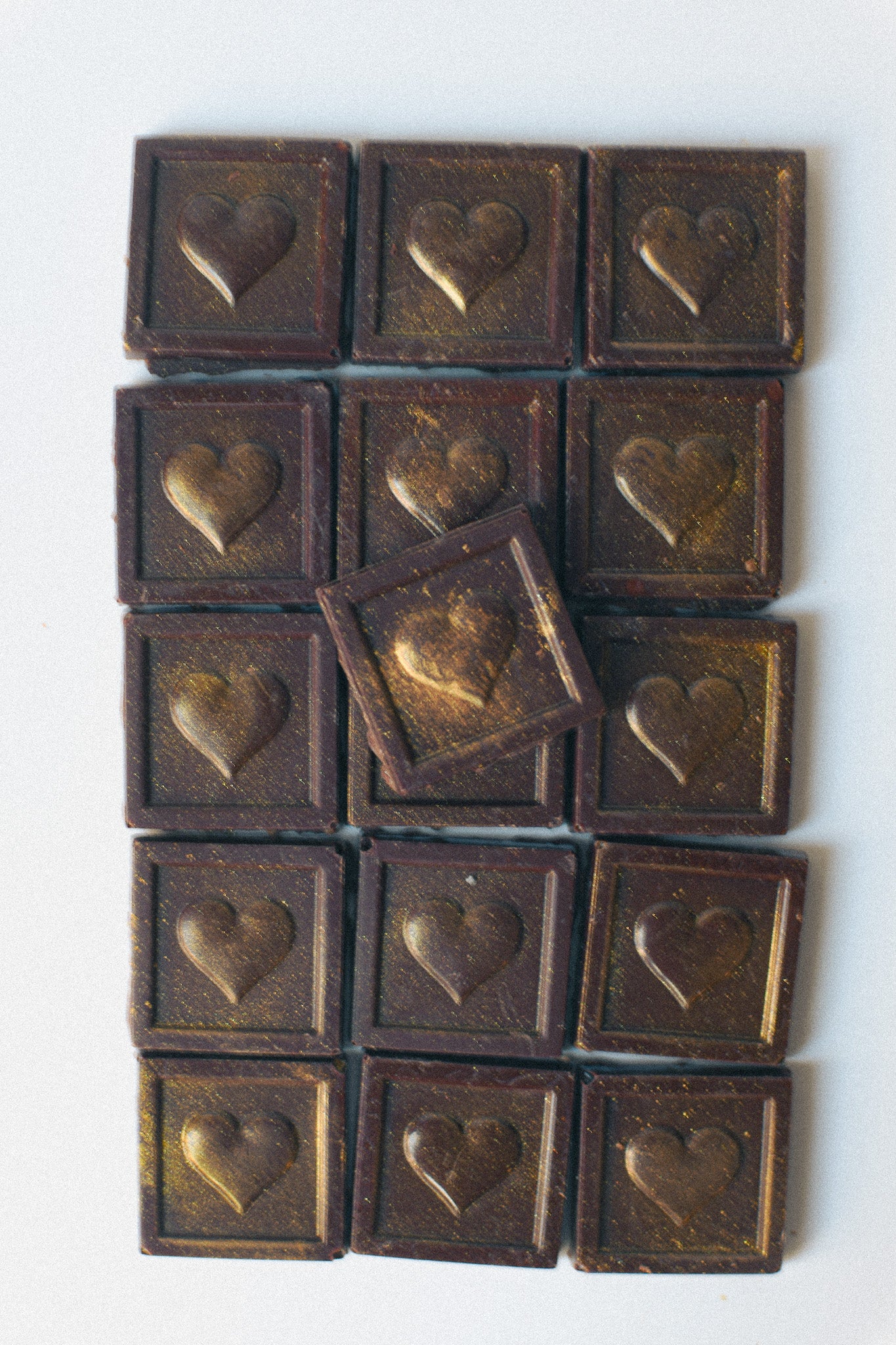 Sixteen handcrafted caraques laced with pulverised 24k gold and filled with an aromatic, crunchy filling to warm your heart.